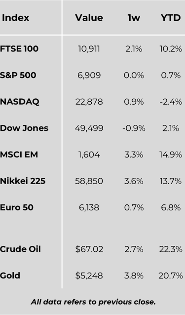 Global markets experienced a mixed week as investors navigated a combination of technological disruption, geopolitical tensions, and economic data releases. In the US, concerns about artificial intelligence (AI) and trade uncertainties weighed on equities, while Treasury yields fell amid risk aversion. Europe benefited from strong corporate earnings, although regional inflation data remained uneven. Asian markets were buoyed by policy optimism and domestic stimulus measures, while emerging markets faced political and election-driven volatility. Commodities reacted sharply to escalating Middle East tensions.