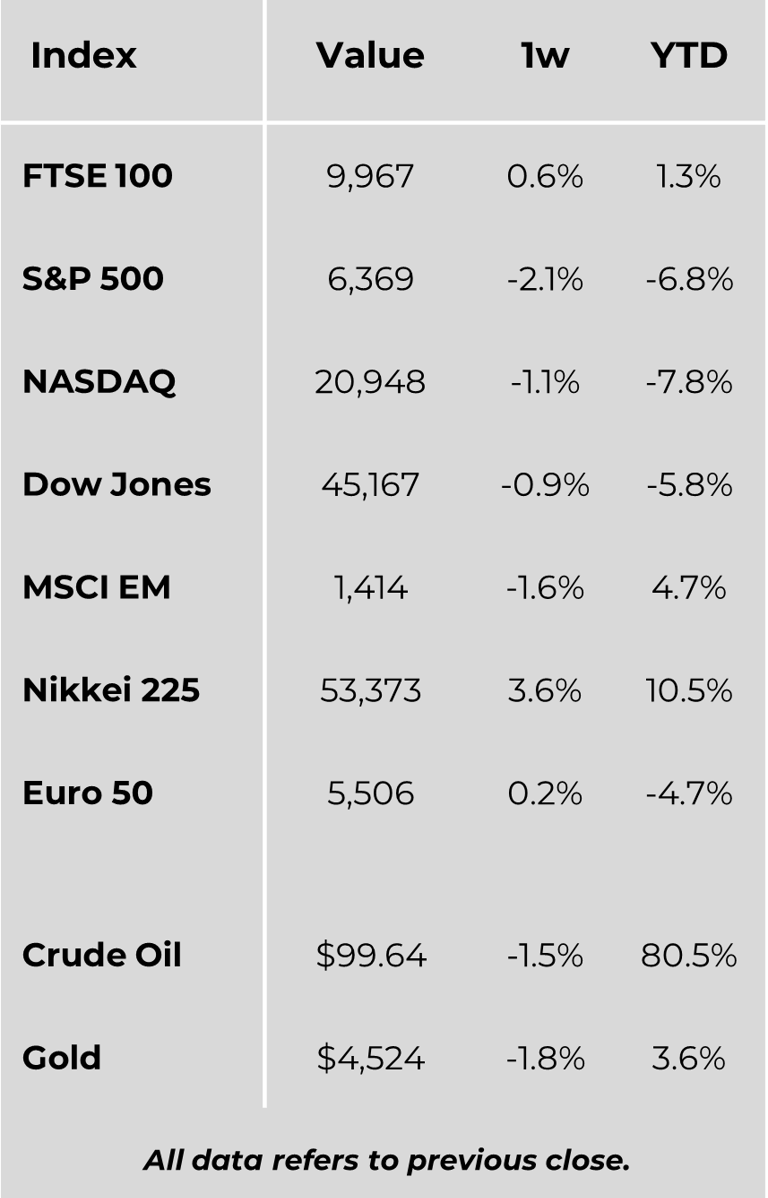 Global markets were driven by geopolitical tensions and rising energy prices, fuelling volatility and inflation concerns. US equities remained under pressure, while Europe showed modest resilience despite weakening growth signals. Across Asia, policy responses to energy shocks intensified, and China faced renewed trade tensions and equity declines, highlighting a fragile and uncertain global economic backdrop.
