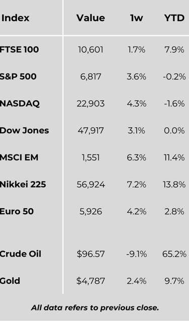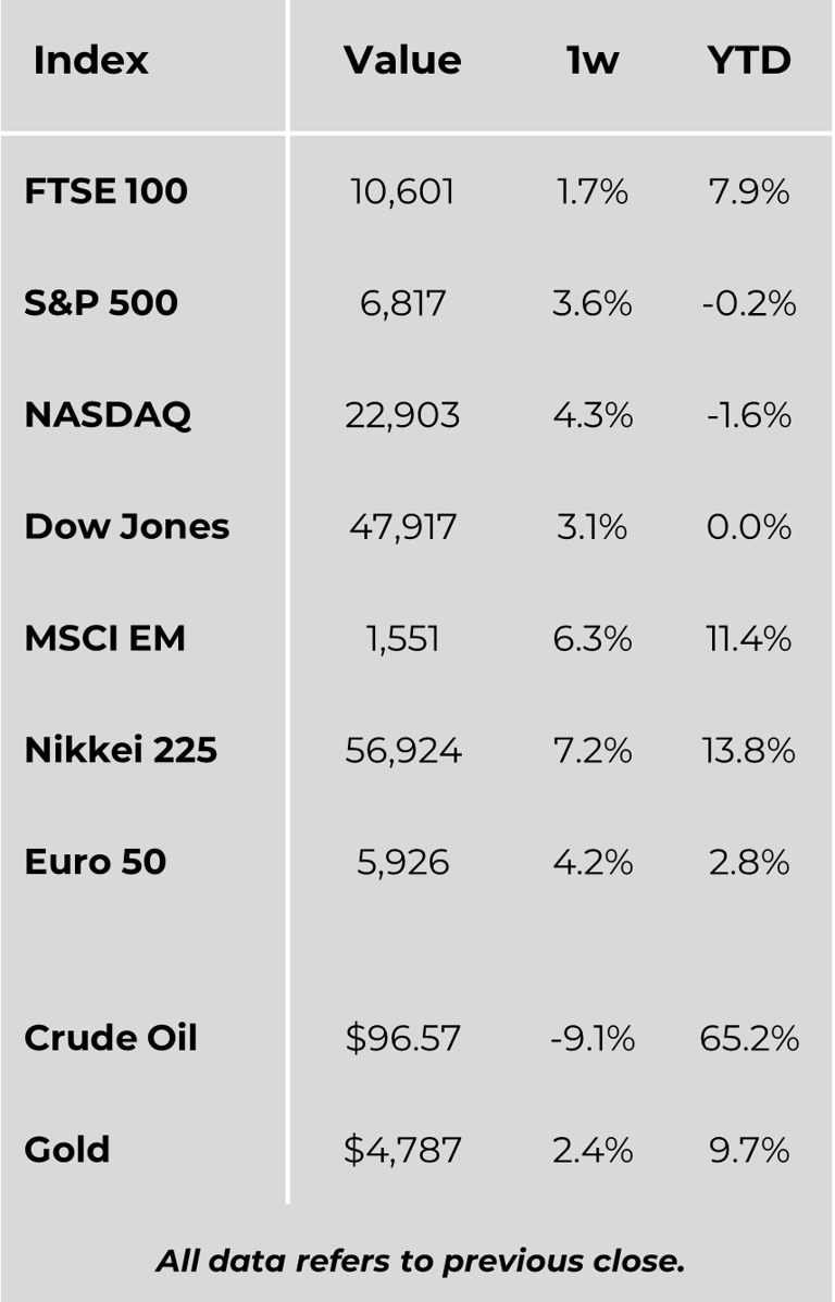 Global markets rallied strongly over the week as geopolitical tensions in the Middle East eased following reports of a US - Iran ceasefire framework. The resulting decline in oil prices supported a broad risk-on move across equities, credit, and currencies. Equities rose across all major regions, led by technology and cyclical sectors, while inflation dynamics and growth concerns continued to shape the broader macroeconomic backdrop.