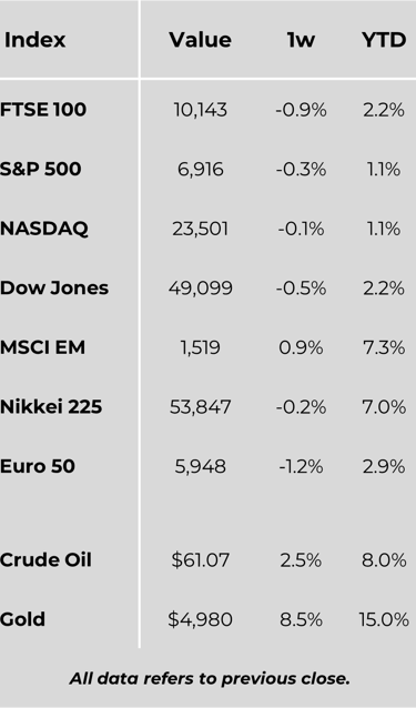 Stocks sold off heavily on Tuesday, with the S&P 500 recording its largest daily decline since October after President Donald Trump announced plans to impose tariffs on European countries opposing US involvement in Greenland. Fears of an escalating global trade dispute weighed heavily on sentiment. However, markets rebounded on Wednesday after Trump signalled a softer approach, citing progress towards a framework agreement with NATO and confirming that the planned tariffs would not proceed. This reversal helped indices finish the week well above their lows.
